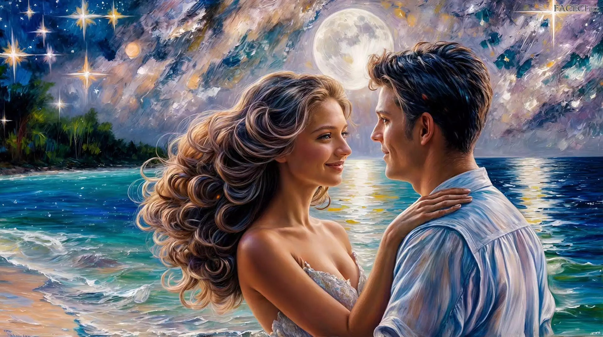 Księżyc, Morze, Grafika, Kobieta, Mężczyzna - faceci.biz